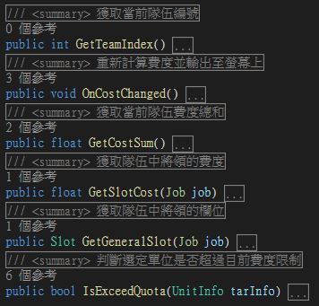 我在黑潮計畫建立的第一個功能,就是遊戲開始前,讓玩家可以編輯自己隊伍的場景。隊伍的建立邏輯主要考量:隊伍的限制,隊伍的更替,以及隊伍的儲存。隊伍建立本身並不是相當複雜的內容,因此我認為比起內部的邏輯與演算,更重要的是團隊其他人需要隊伍資訊時,要調用的方法(Method)是否備便。